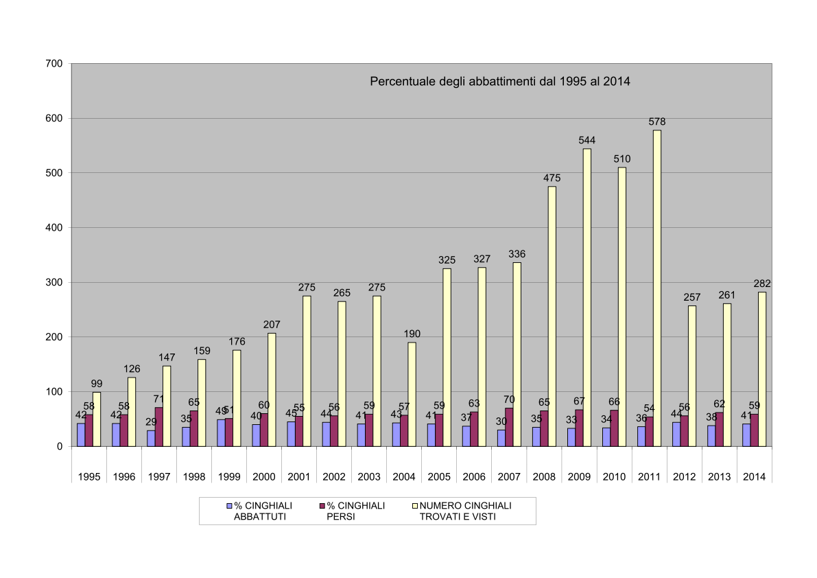 Dal 1995 al 2004, nelle sole battute di caccia ordinaria, i cinghiali abbattuti sono stati circa 797 con una media annua di 80 capi, per arrivare addirittura ai 1.405 ungulati abbattuti nelle ultime 10 stagioni di caccia, dal 2005 al 2014, senza computare ovviamente i prelievi effettuati nelle battute di controllo, ottenendo la straordinaria media annua di circa 140 cinghiali a stagione.
